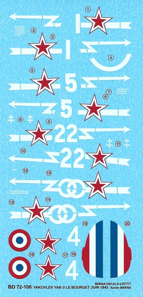 Berna Decals - 1/72 Yakovlev Yak-3 Normandie-Niemen: n 1 Cne Marcel Albert 20/06/1945, n 5 S/Lt Roger Sauvage 20/06/1945, n 22 Asp. Pierre Douarre 20/06/1945, N OO Lt-Col Louis Delfino 20/06/1945, n 4 Lt Roger Marchi 06/1946