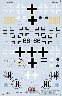 Cam Decals - 1/48 Messerschmitt Bf-109G-6 (4) Yellow 280 Unknown Training Unit, Black 66 Lt Molnar Hungarian Air Force 1944, Jg 5 Major Carganico Finland 1943, White 365 365 Sqn 150 Gruppo Italian Air Force 1943