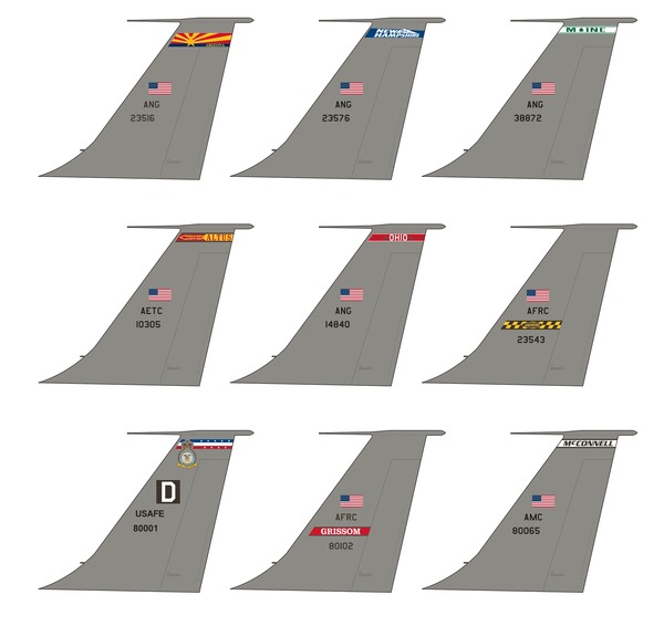 Caracal Models - 1/144 USAF KC-135R Stratotanker The workhorse of the USAF tanker fleet since the 1960s, the KC-135 Stratotanker will be serving the USAF (and its allies) well into the 2010s. Our latest decal sheet is a very comprehensive tribute to the current version of the Stratotanker : the KC-135R. Our first 1/144 scale sheet is a scaled-down version of our best-selling 1/72 KC-135R sheet. This extensive set features markings for 16 different units from every command that operates the KC-135R. We are sure you will agree that there has never been a more comprehensive KC-135R sheet in any scale! Designed to fit the Minicraft KC-135R kit. Only 300 sets were printed. KC-135R 62-3516, 161 ARW, Arizona ANG KC-135R 62-3576, 157 ARW, New Hampshire ANG KC-135R 63-8872, 157 ARW, Maine ANG ("Maine Freeze" nose art) KC-135R 61-0305, 97 AMW, Altus AFB KC-135R 61-4840, 121 ARW, Ohio ANG KC-135R 62-3543, 459 ARW, Andrews AFB KC-135R 58-0001, 100 ARW, RAF Mildenhall ("Wolff Pack" nose art) KC-135R 58-0102, 434 ARW, Grissom AFB KC-135T 58-0065, 22 ARW, Mc Connell AFB KC-135R 60-0345, 127 Wing, Michigan ANG KC-135R 60-0318, 154 Wing, Hawaii ANG KC-135R 59-1506, 185 ARW, Iowa ANG KC-135R 59-1500, 126 ARW, Illinois ANG KC-135R 60-0348, 18 Wing, Kadena AFB KC-135R 62-3512, 128 ARW, Wisconsin ANG KC-135R 62-3514, 108 ARW, New Jersey ANG