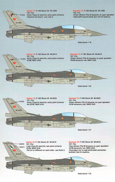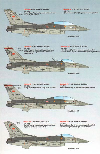 Caracal Models - 1/48 Lockheed-Martin F-16C/F-16D Turkish Air Force Part 1. Full markings, numbers, national insignia, squadron badges etc to build any aircraft from 141 Filo, 142 Filo, 143 Filo, 151 Filo, 152 Filo, 161 Filo and 161 Filo. 22 very colorful options.