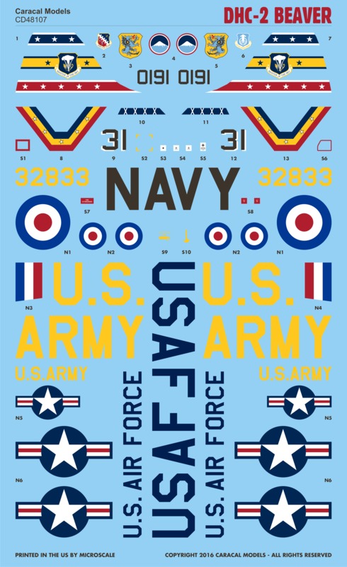 As a very versatile and capable STOL ([i]short take-off & landing[/i]) utility aircraft, the DHC-2 Beaver had served many militaries around the world. Many are still flying in civilian service. Our first sheet for the Beaver features markings for several military operators of this important type.