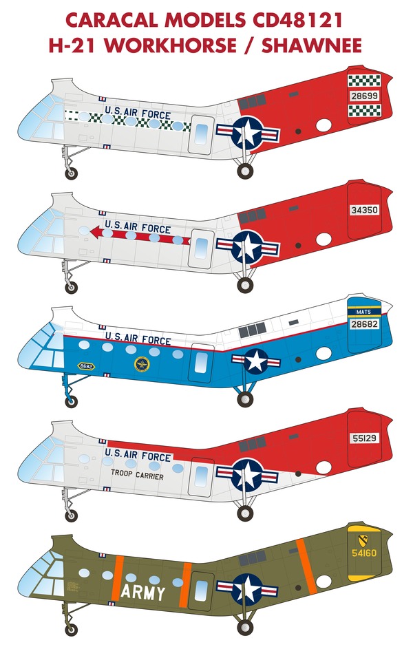 Caracal Models - 1/48 Also known as the Flying Banana, the Piasecki H-21 was a highly innovative tandem-rotor helicopter for its time. Designed for the 1/48 scale Italeri kit, this decal sheet provides accurate markings for five H-21's from USAF and US Army units.