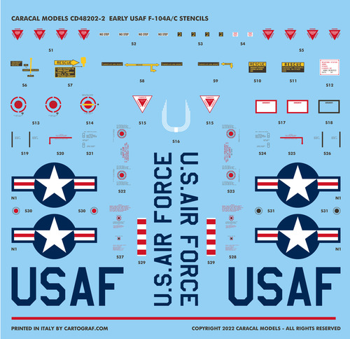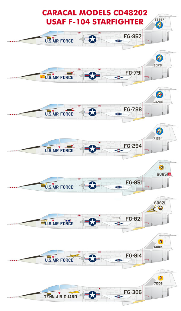 This comprehensive decal set features fifteen (15) marking options for Cold War era USAF Starfighters, both from active duty units and the three Guard units selected to fly the type. The set includes a very comprehensive, carefully designed stencilling sheet with the attention to detail you expect from Caracal.