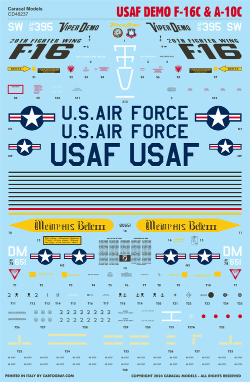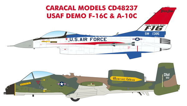 Caracal Models - 1/48 USAF Demo Lockheed-Martin F-16C & Fairchild A-10C Markings for the 2024 USAF Viper Demo in retro YF-16 scheme, and USAF demo A-10C 'Memphis Belle III'.
