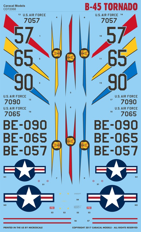 This new decal sheet provides accurate and complete markings for the recent Valom kit of the B-45 Tornado, the first jet bomber of USAF. Our decals correct the many accuracy issues in the kit sheet and provide options for three squadrons attached to the 47th BW based at the UK during the 1950s.