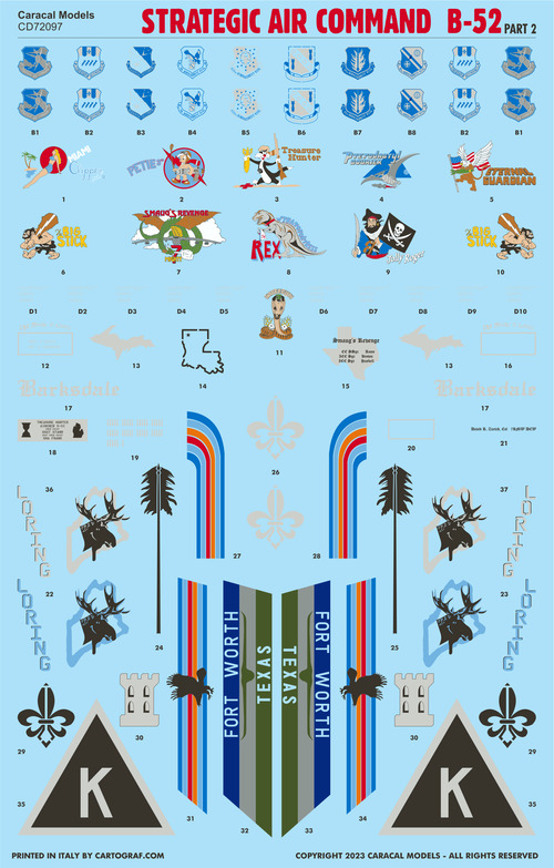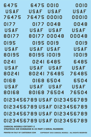 We are proud to present this comprehensive decal set featuring ten 10 marking options for the Cold War era USAF B-52 Stratofortress bombers, encompassing multiple units that have flown this incredible machine. This set includes a meticulously designed stenciling sheet that embodies the precision and attention to detail you've come to expect from Caracal.