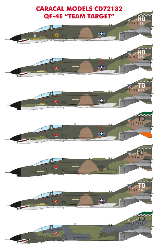Caracal Models - 1/72 McDonnell QF-4E 'Team Target' The last Phantoms in USAF service were the QF-4E full-scale aerial targets, which were converted from the USAF Phantom inventory for optionally unmanned flight. This comprehensive 1/72 scale decal sheet provides markings for seven different QF-4E full-scale aerial targets of the 82nd Aerial Targets Squadron at Tyndall AFB. Many of these QF-4Es wear an attractive glossy finish that was seen on the aircraft of the unit just prior to the retirement of the type.
