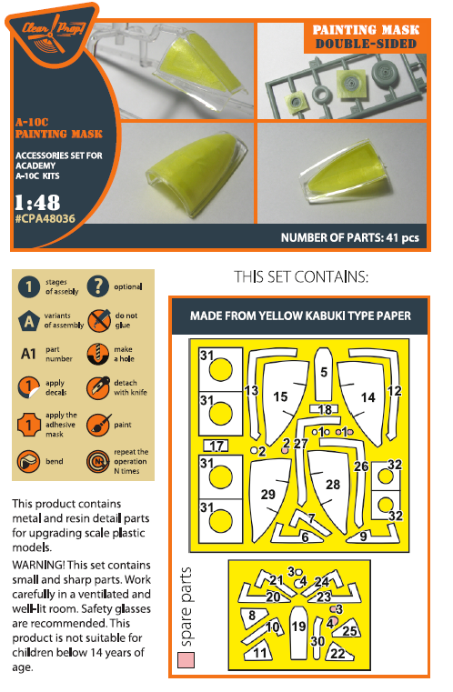 Clear Prop - 1/48 Fairchild A-10C Thunderbolt II double-sided painting mask on 'yellow kabuki paper' (for Academy kits)