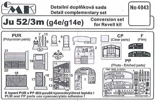 CMK - 1/48 Junkers Ju-52/3M interior set. Vac canopy, photo etched parts, instrument panel, interior, seats, doors (for Matchbox and Revell kits) Loading machine not included.