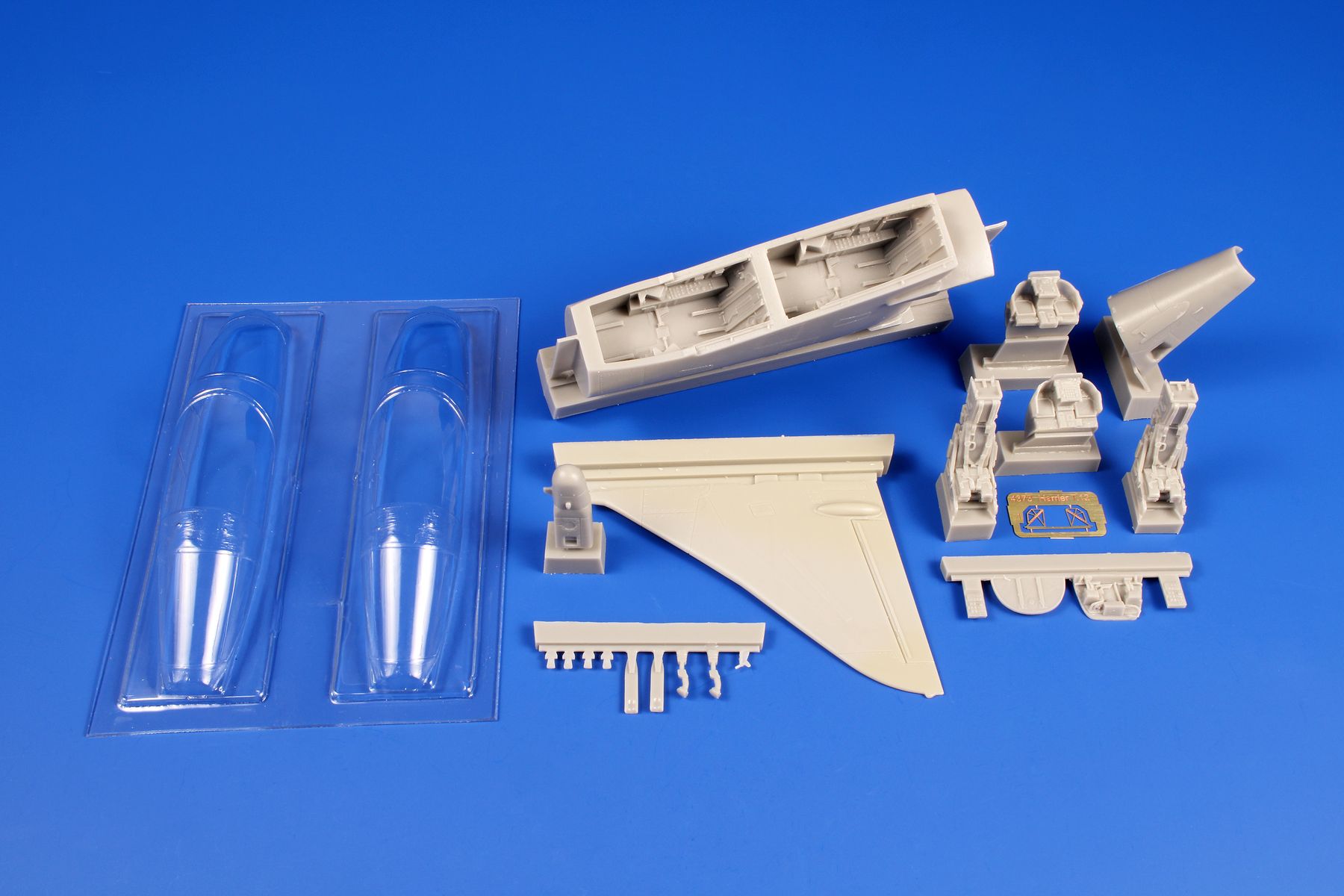 CMK - 1/48 BAe Harrier T.12 Conversion set enabling the modeller to use Hasegawa GR.7 Harrier and build it into the two-seat Harrier T.12 version. The set contains resin cast detail parts, etches, vacuum-formed canopy hoods and a sheet of decals for two British options. (for Hasegawa kits)