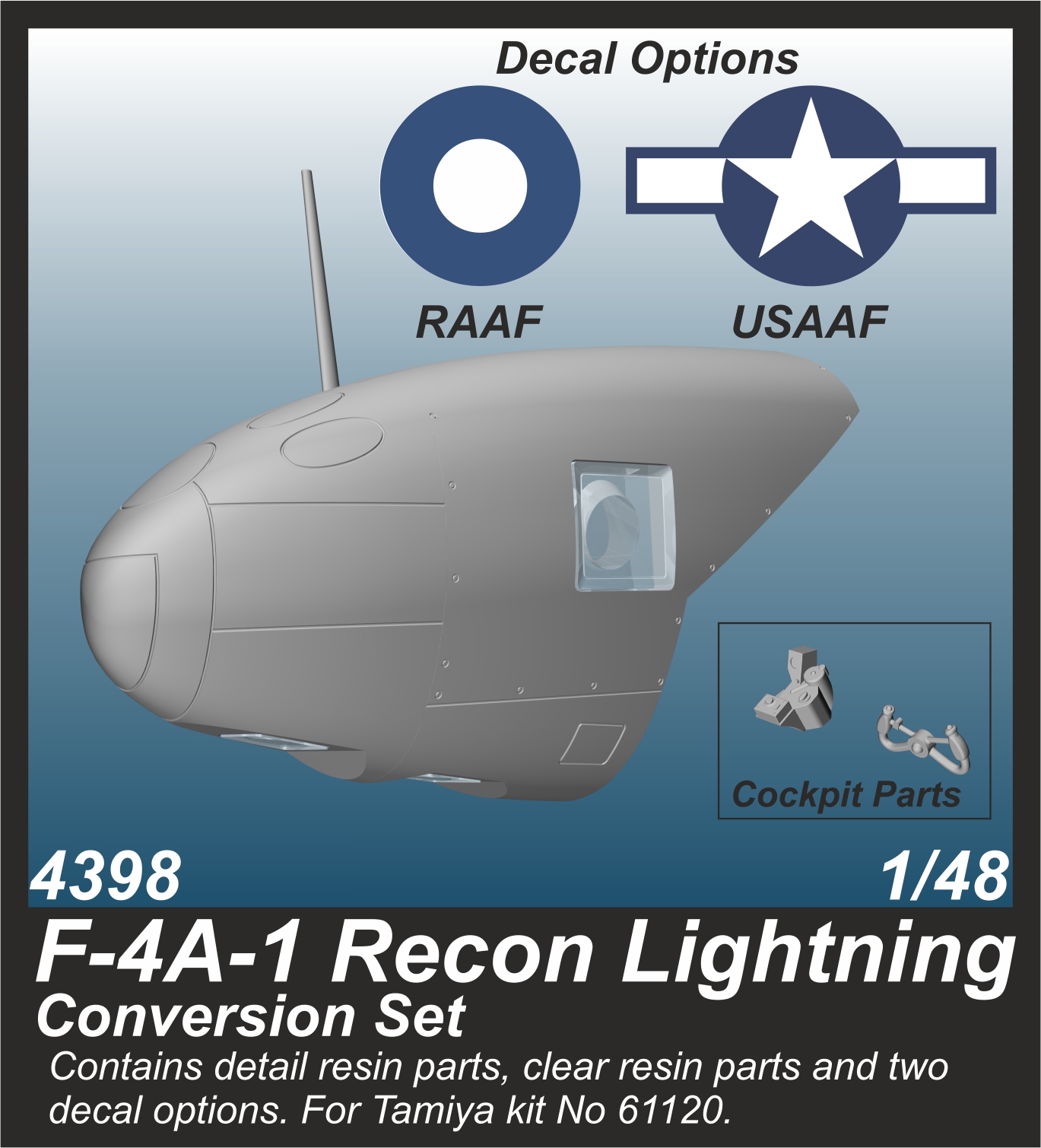 CMK - 1/48 Lockheed F-4A-1 Recon Lightning Conversion (expected 06/2020) (for Tamiya kits) This conversion sets brings the modeller the opportunity to turn their new Tamiya P-38F/G (item no.61120) into the first combat-deployed recon version of this unique aircraft. The set consists of new resin nose parts and clear camera windows made from special, heat treated clear resin. The decals cater for a Usaaf machine as operated from New Guinea and a Raaf one as flown from bases in northern Australia.