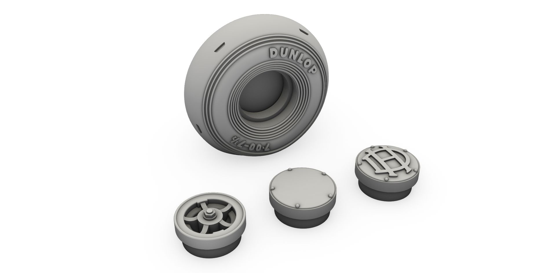 CMK - 1/48 De Havilland DH.82a Tiger Moth Mainwheels and Tailskid with Wheel . The resin cast main undercarriage post-war Tiger Moth wheels feature finely rendered and crisp detail as well as the manufacturer s logo. On top of that all, the resin set also brings three styles of the wheel hubs, both on the outboard side of the wheel and the side close to the wheel axle. These three styles are as follows-a simple hub without any cover, a hub with a plain cover and a hub cover with the manufacturer s initials. The tailskid with a wheel is made of special, very hard and heat treated resin material to endure the weight of the model (for Airfix kits)