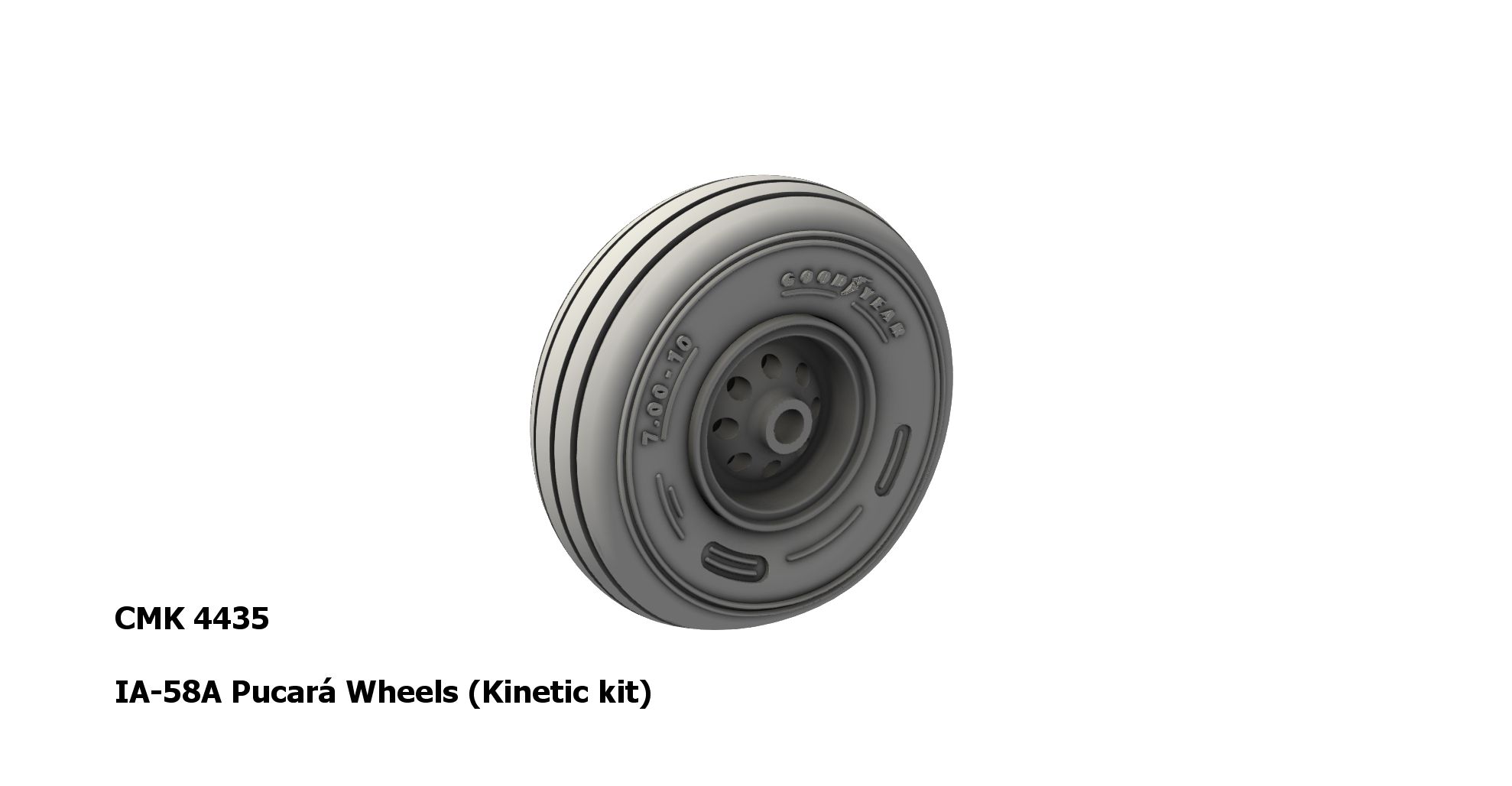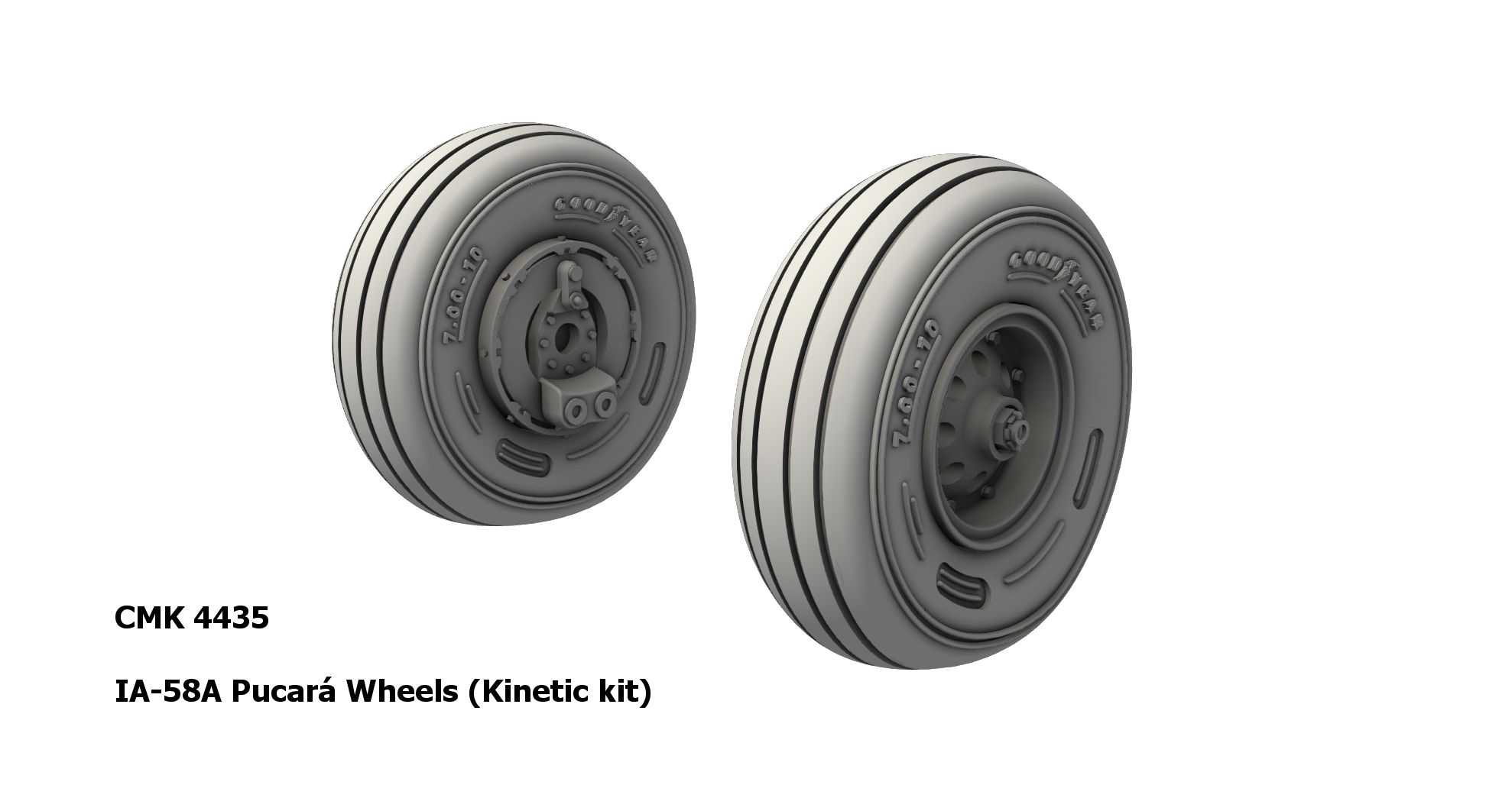 Nicely detailed undercarriage wheels for Kinetic's IA-58 Pucari Argentina ground attack plane model.