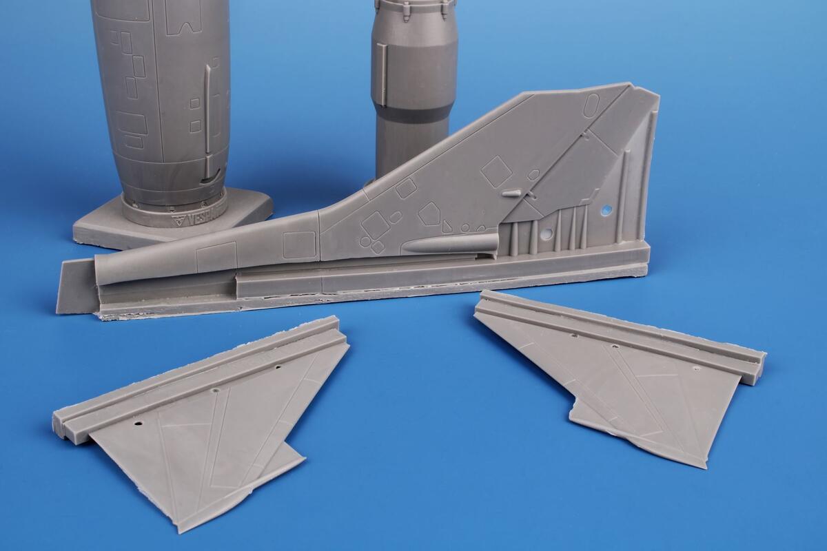 CMK - 1/48 Sukhoi Su-22M-3K Fitter J (Tumansky R-29BS-300 engine) Conversion (for Kitty Hawk Model kits) The Sukhoi aircraft of the Su-17/22 family came out of the production plant with two types of the engine. They could be either fitted with a Lyulka jet of the Al-7F-1 or AL-21F-3 types, or with Tumansky R-29BS-300 power unit which differed in size from the Lyulkas. The 1/48 kit made by Kitty Hawk offers only one variety of the rear fuselage section as used with the AL-21F-3 unit. Not only contians this set the differing rear fuselage, it also contains the differnt vertical tail unit and a sheet of decals covering one Russian and one Libyan airframe.