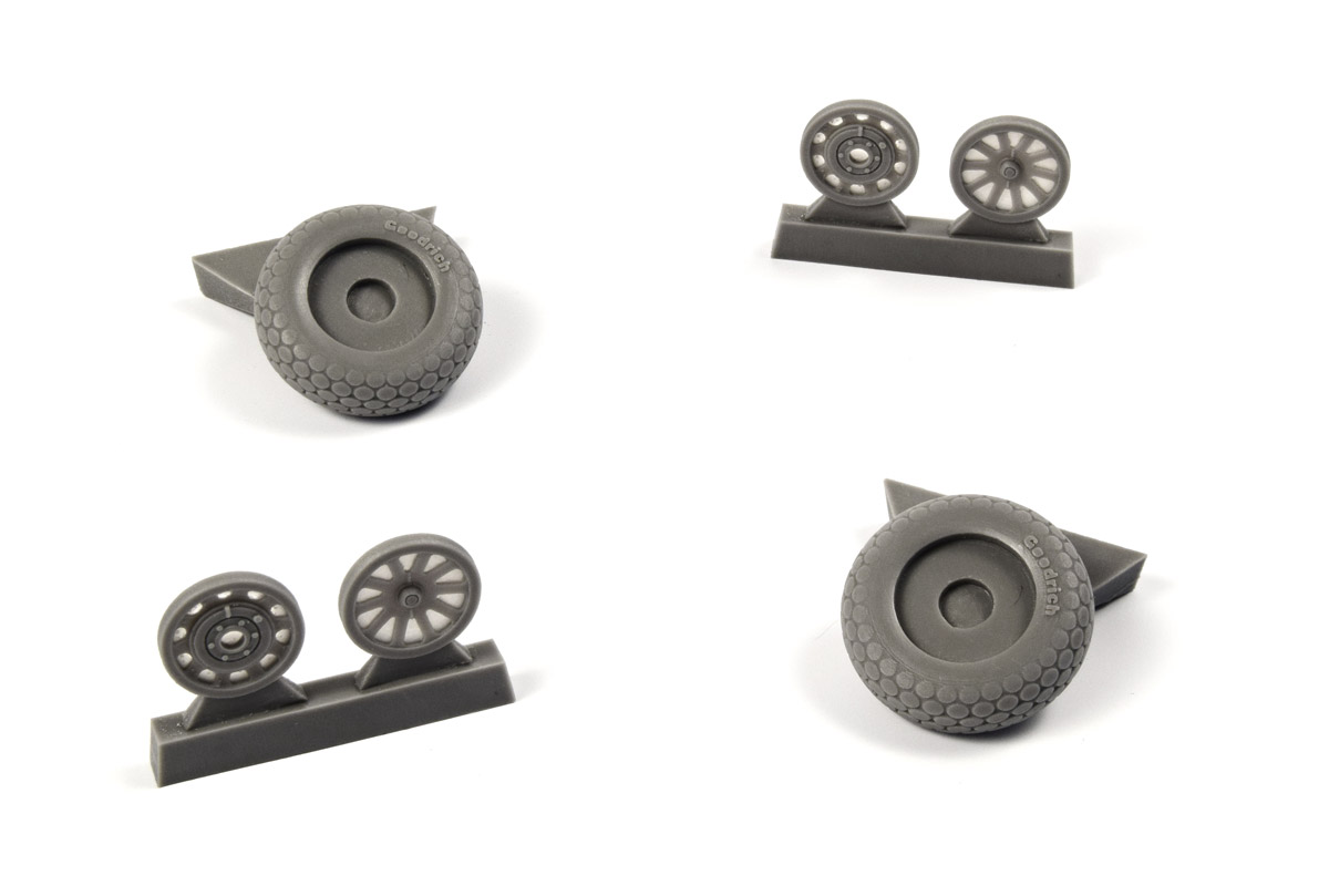 CMK - 1/32 North-American P-51D Mustang-Wheels (Oval Tread Pattern) (for Revell kits) This set contains a pair of new mainwheels with oval tread pattern tyres.This type of tyres was used on the P-51D mainly in the ETO. The wheel hubs and brake details come as separate parts which makes the painting process easier for the modeller. The wheels are designed for the Revell P-51D kit and fit precisely onto the pivot of the kit s undercarriage legs or that of CMK correction set no. 5123 1/32 P-51D Main Undercarriage Strengthened Legs (made of heat-treated resin strong enough to deal with the weight of the model). The master pattern was 3D designed and produced using a 3D printer.