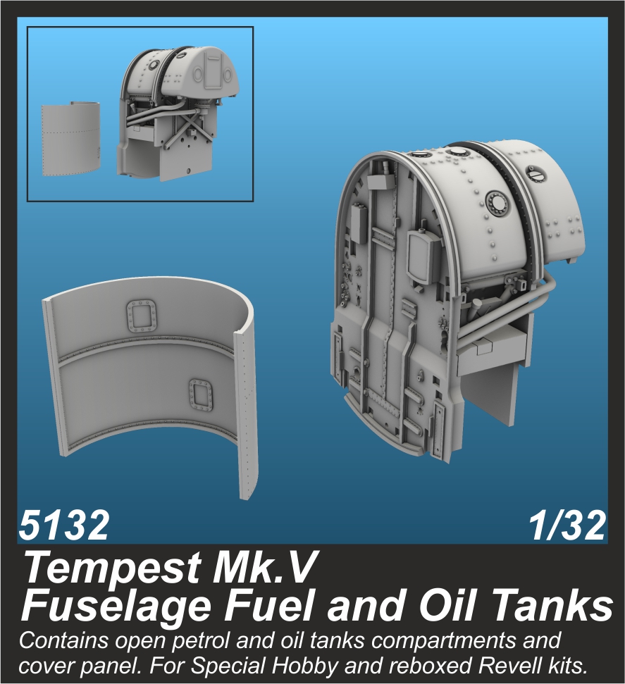 CMK - 1/32 Hawker Tempest Mk.V Fuselage Fuel and Oil Tanks. This set offering the open petrol and oil tanks compartments has been made to fit the Special Hobby s Tempest Mk.V as well as the same kit reboxed by Revell. The tanks were placed inside the fuselage, between the engine and the pilot s office. Covering panels come with the set as well. (for Revell and Special Hobby kits)