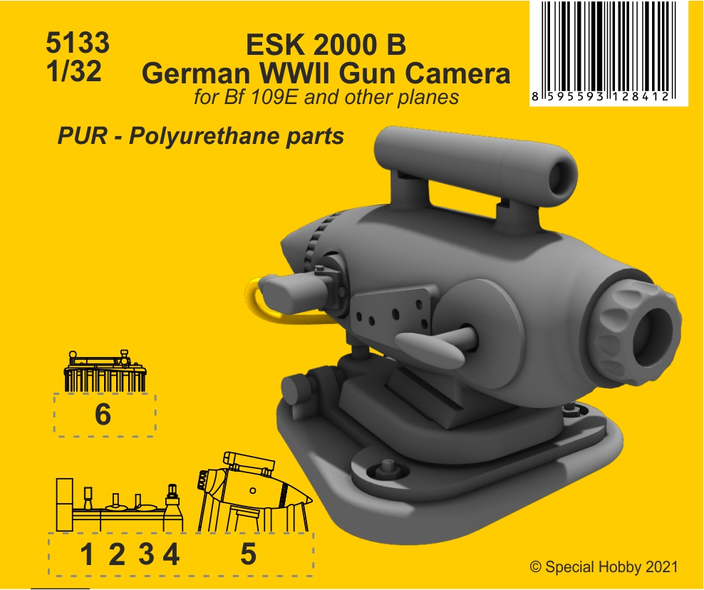 CMK - 1/32 Esk 2000 B German WWII Gun Camera. The German camera gun could be mounted on either the wing or fuselage of the Bf 109 and other single engine fighter planes and was used for combat training. Some other types, as the Bf 110, could carry the gun inside the nose.