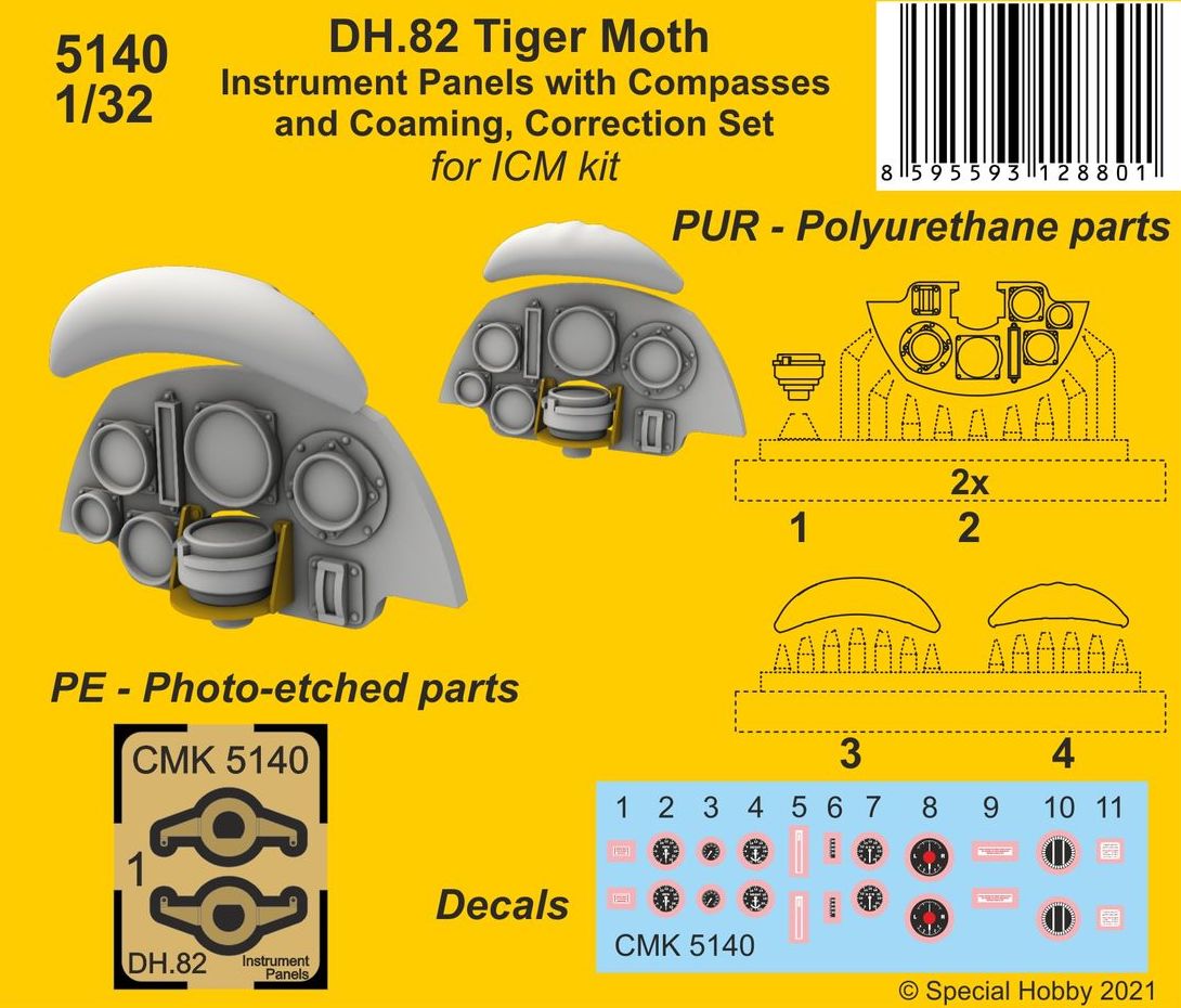 CMK - 1/32 De Havilland DH.82 Tiger Moth Instrument Panels with Compasses and Coaming, Correction Set (for Icm kits) This correction set brings two new instrument panels and a pair of compasses for the ICM's new Tiger Moth model. Etched parts and decals included too.