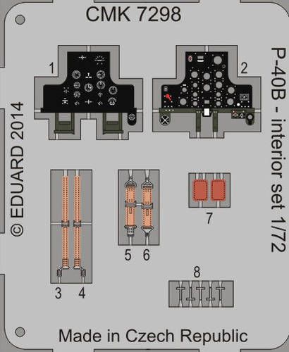 CMK - 1/72 Curtiss P-40B/P-40C Interior set (for Airfix kits) Set contains completely new cockpit for the early WWII period US fighter. The set also contains new floor, sidewalls, fuselage bulkheads, seat, control stick, instrument panel and other small details. The set contains colour photo-etched parts.