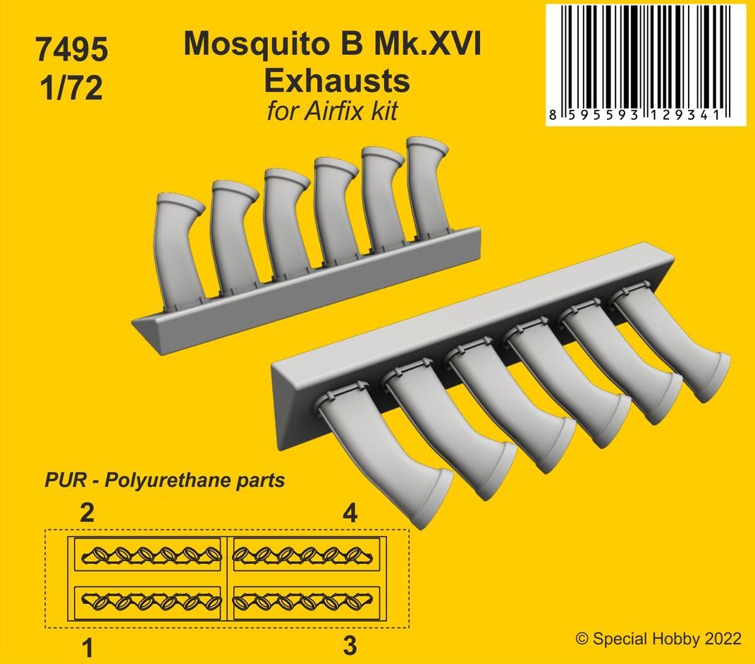 CMK - 1/72 De Havilland Mosquito B Mk.XVI Exhausts (for Airfix kits) Resin cast exhausts featuring fine levels of detail, 3D designed and readily replace the original styrene ones which lack most of the details, the hollowed out openings and come in wrong shape.