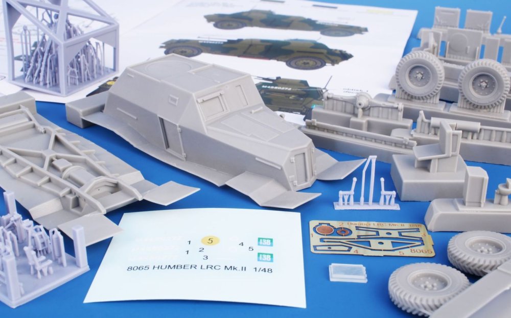 CMK - 1/48 Humber Lrc Mk.II Resin cast model of a British armoured car used during WW2. The Humber LRCs were mass produced in Mk.2, Mk.3 and Mk.3a versions and saw service in the British Isles, Western and Southern Europe, in Africa and in India, too. The units operating these vehicles belonged to the British Army, Raf and the Indian Army. On top of that the vehicles were also used by Britain-based units with Polish and Czechoslovak personnel. The decal sheet covers An Isle of Wight based Humber Mk.II vehicle of the 29th Independent Squadron and another Humber of the Czechoslovak Independent Brigade in Great Britain. The major parts of the model are resin cast, the kit also contains a fret of etches and a few 3D-Printed parts.