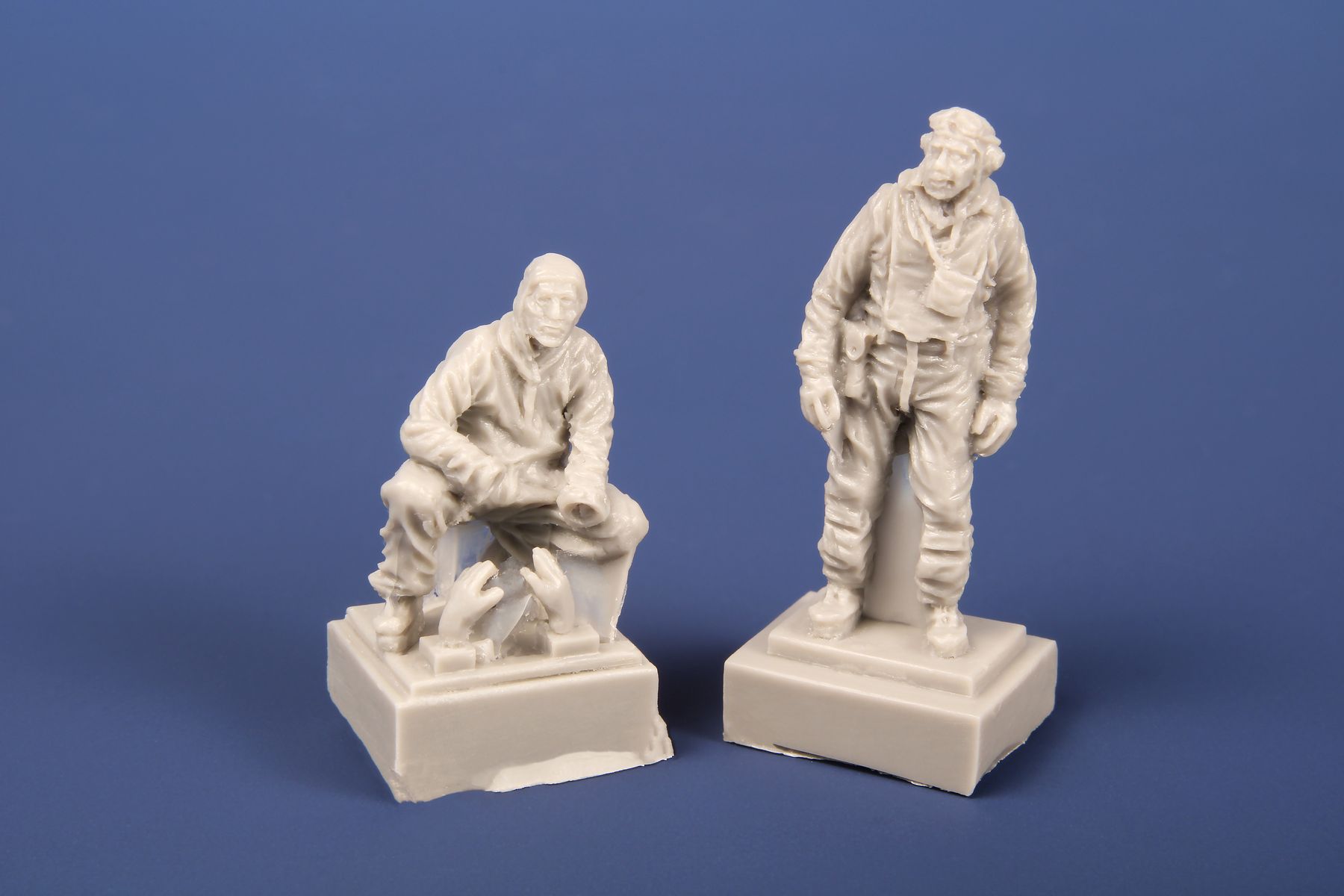 The set offers a figure of a navy pilot standing beside his Hellcat (it is also okay to place him next to another type, F4F-5/F4F-3, F4U etc..). His mechanic crouches nearby ready to remove the wheel chocks. (for Airfix, Eduard Hasegawa etc kits)