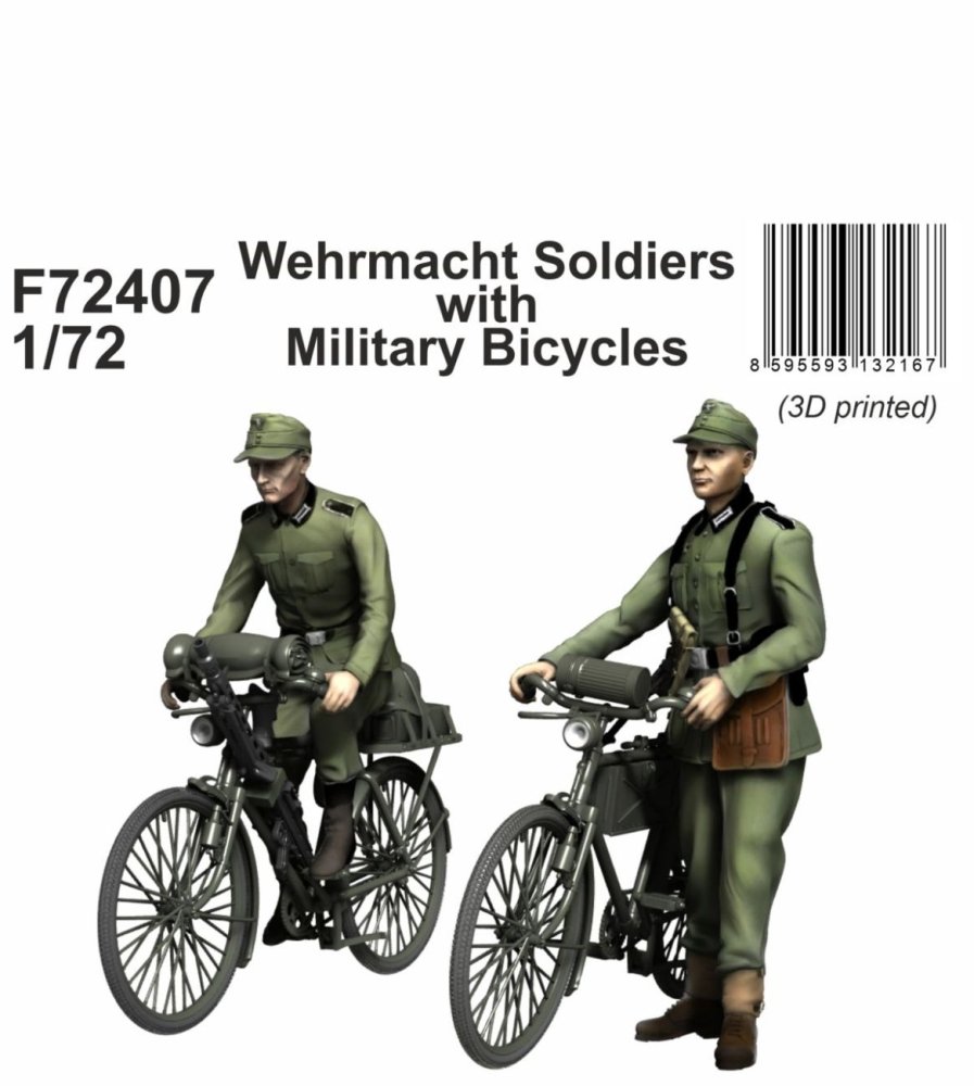 CMK - 1/72 Wehrmacht Soldiers with Military Bicycles The same pair of soldiers as in the 1/48 set, now scaled down to 1/72 and 3D printed. A pair of German soldiers with military type bicycles and armament. One soldier rides his bike, the other one pushes it besides him. The armament carried on the bikes is quite varied, from a rifle to a pair of panzerfausts. All parts 3D-printed with superb detail levels.