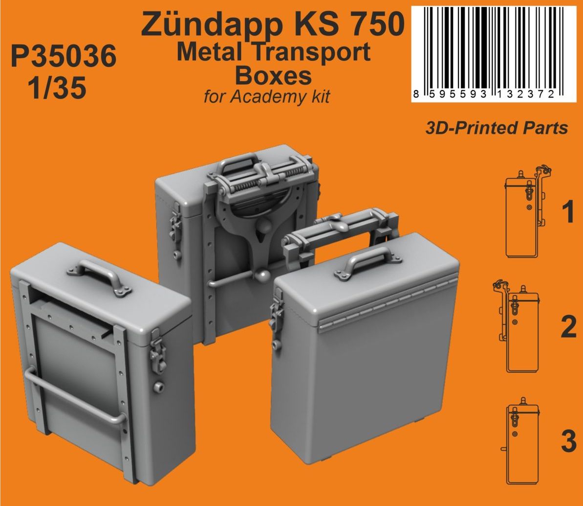 CMK - 1/35 Zundapp Ks 750 Metal Transport Boxes (for Academy kits) Academy's Zundapp Ks 750 / Pz.IB kit offers just the leather saddlebags to the motorbike. At least starting with the latter half of the war, metal-type boxes were in use instead of leather bags, and these were also more durable, easier to manufacture and cheaper. Our set offers these metal type boxes with nice detail overall.