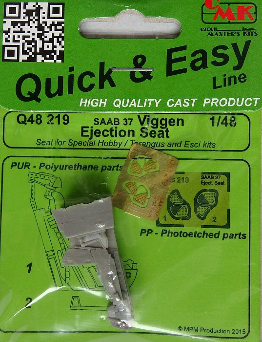 CMK - 1/48 Saab JA-37 Viggen Ejection Seat (designed to be used Special Hobby and Tarangus kits) Highly detailed ejector seat for all versions of the Swedish SAAB 37 fighter plane. The seat comes with a whole set of seat belts and it also contains a photo etched leg restraints.