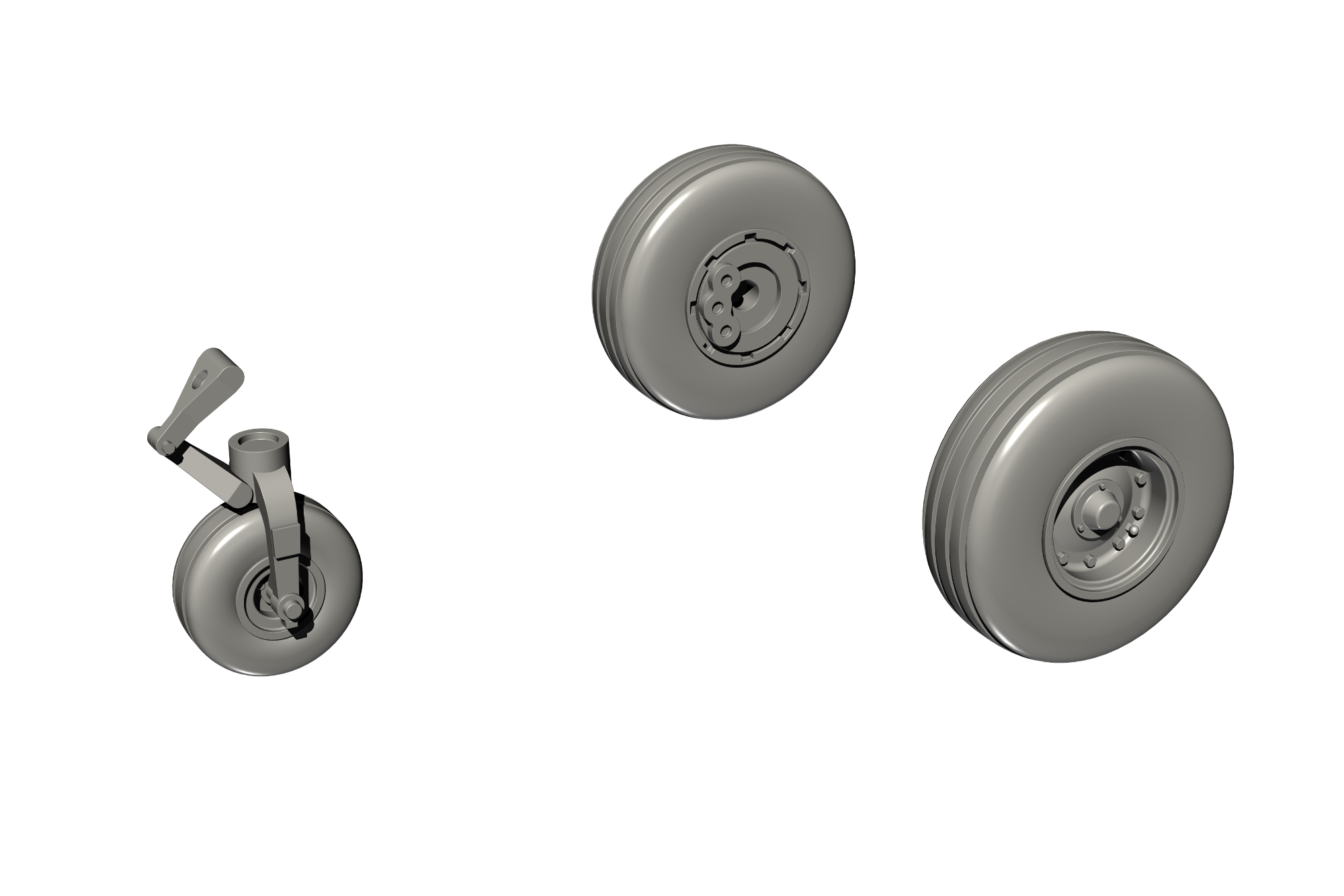 CMK - 1/72 Short Tucano T.1-Wheels Set (for Airfix kits) This set contains a nosewheel and two main undercarriage wheels for a model of the British Tucano trainer aircraft. The nosewheel is prepared with a section of the front undercarriage leg, the nicely detailed torque links come as separate parts. The master parts were 3D-designed and produced using a 3D printer. The wheel hubs offer much more detail, and unlike the original kit s parts they have also detail of brakes on them. The tyres also feature realistic tread pattern.
