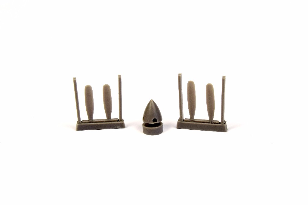 This set contains a corrected four-bladed propeller for Airfix Short Tucano kit. The blades are separate items that are to be attached to our correctly shaped spinner.