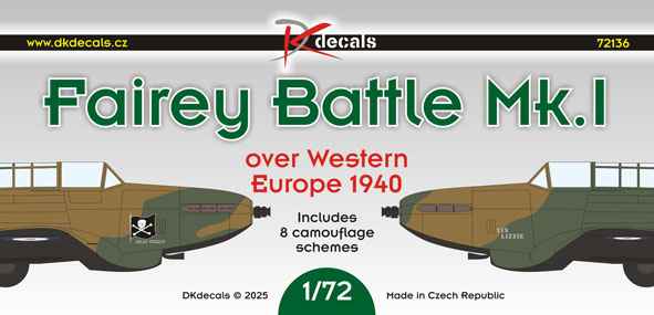 DK Decals - 1/72 Fairey Battle Mk.I1. Battle Mk.I, L5549, No.301 Sq. RAF2. Battle Mk.I, L5216, No.88 Sq. RAF3. Battle Mk.I, L5513, No.103 Sq. RAF4. Battle Mk.I, K9327, No.103 Sq. RAF5. Battle Mk.I, K9330, No.226 Sq. RAF6. Battle Mk.I, K9342, No.105 Sq. RAF7. Battle Mk.I, K9325, No.218 Sq. RAF8. Battle Mk.I, K9183, No.226 Sq. Raf