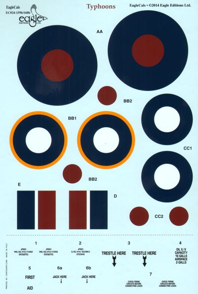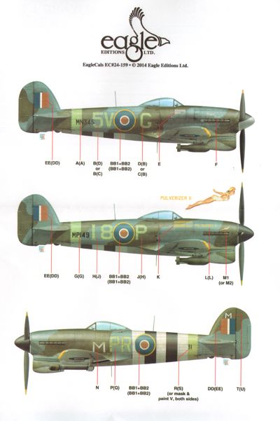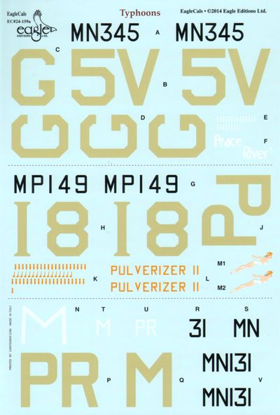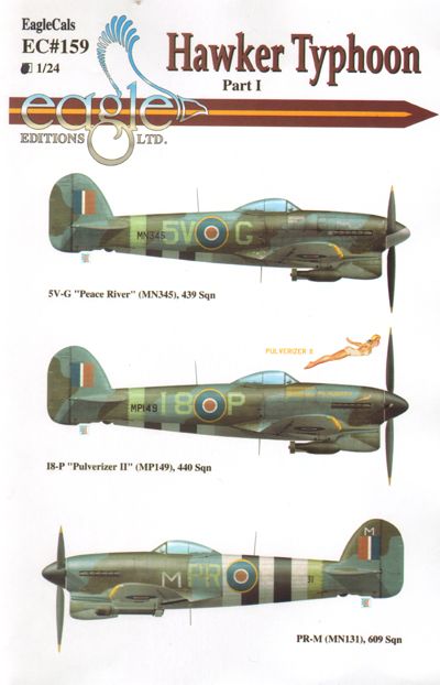 Eagle Cal - 1/24 Hawker Typhoon Mk.IB in 1/24th scale Peace River 5V-G 439 Sqn MN 345 Pilot F/O J.A Brown Pulverizer II I8-P 44p Sqn MP149 Pilot F/O Harry Hardy DFC PR-M 609 Sqn MN 131 Pilot F/L L.E.J.M. Geerts