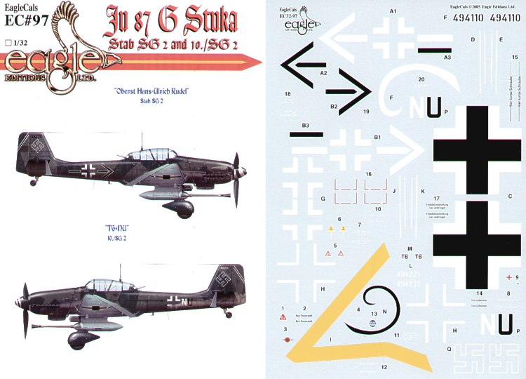Eagle Cal - 1/32 Junkers Ju 87G (2) Black ? Stab SG 2 Oberst Hans Ulrich Rudel, the aircraft used for his final flight to surrender 8/5/45; T6+NU 10/SG.2 pilot unknown. Both RLM 70/71/65