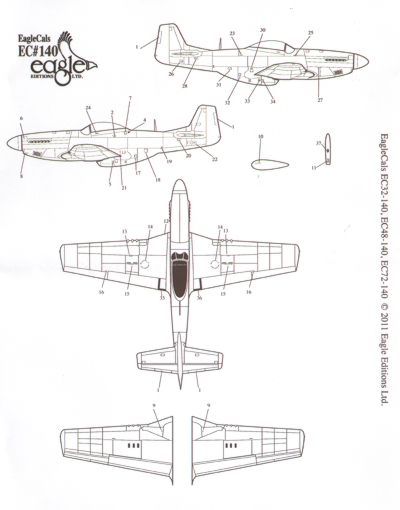 Eagle Cal - 1/48 North-American P-51D Mustang Part 2 (3) 44-13305 WR-Z 355th FG Capt Henry Brown "Hun Hunter/Texas", non standard OD on upper surfaces, white nose, partial D-Day stripes, 44-13410 E2-C 361st FG Col. Thomas J.Christian "Loi IV/Athelene" non standard OD/Dk Green uppersurfaces, yellow nose, partial D-Day stripes, 44-13878 HO-Y 352nd FG Maj. John Bennett, Sharkmouth, Blue nose