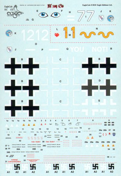Eagle Cal - 1/72 New Erich Hartmann Messerschmitt Bf-109G-6 recently discovered! This colorful aircraft was flown by Hartmann in Rumania when he achieved his 250th victory with 9./JG 52, 4 June 1944. On the Hartmann G-6, of special interest is the small Red number '2' inside the 'Yellow 1' which is believed to be indicative of his back-up machine Decals were produced based on stills taken from the original period film, Includes two more colorful Bf-109G-6s. 'White 12' II./JG 51 Hans Langer including the 'YOU NOT!' on the horizontal stabiliser. 'White 7' W. Nr. 163269 early version, II./JG 51 Elias K?hlein