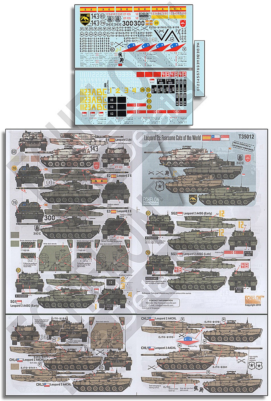 Echelon FD - 1/35 Leopard 2s: Fearsome Cats of the World. Continuing with the Leopard 2 series, this set covers Leopard 2s spanning across the globe. Seeing nations like Singapore (small island nation in South East Asia), Chile (Western Coast of South America) and Spain (South Western Europe) utilitising one or more form of the Mbt as their main spearheading ground assets. Besides specific marking options, the set also provides generics, allowing modellers to detail their builds down to their own references. 3 kinds of deck stencils are provided. The Spanish Leo 2s utilises light gray stencils (in Spanish). The Chilean MBTs used black ones, given that their Leos are in medium sand. And the white ones used by Leo 2 A4SGs (in English). Deck stencils in English are not new, as Canadian Leo 2s had them (in set D356044), although the ones in this set had slight differences. The Spanish stencils are all new, based on extensive research effort. As there are already a number of Spanish Leo 2 decals available in the market, thus the Spanish deck stencils in this set will complement those.