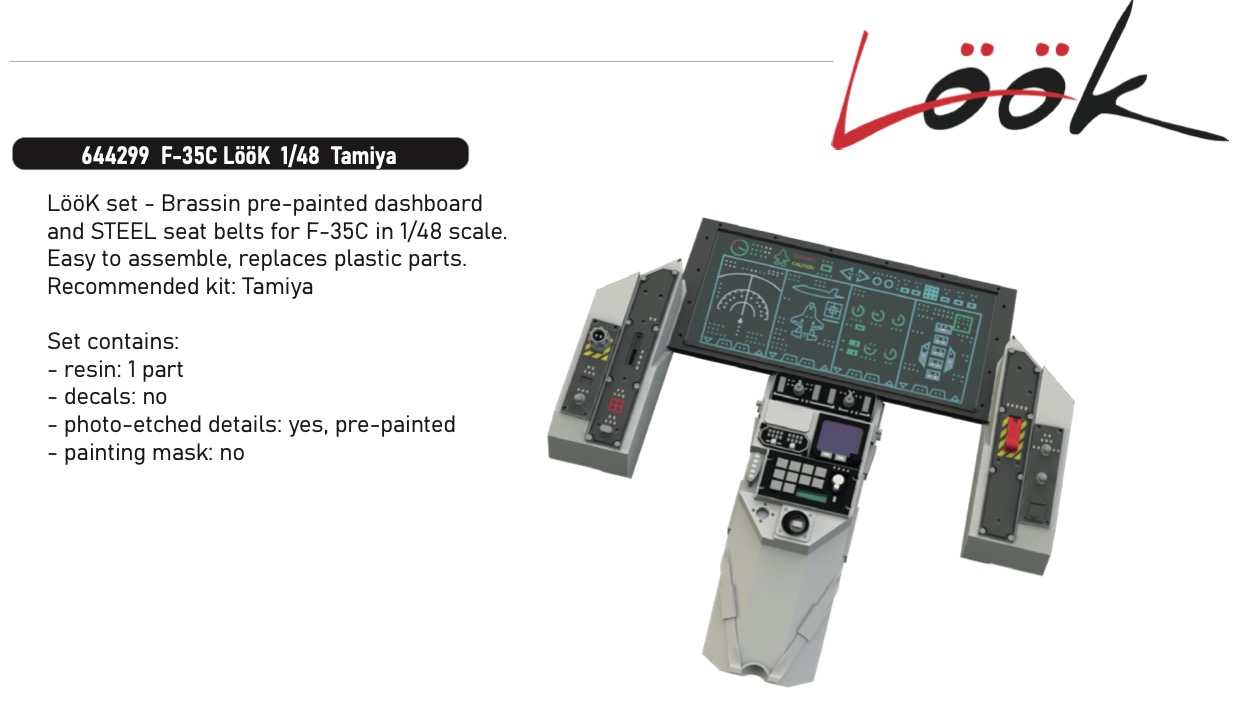 Eduard - 1/48 Lockheed-Martin F-35C Lightning LooK set Brassin pre-painted dashboard and Steel seatbelts for F-35C in 1/48 scale. Easy to assemble, replaces plastic parts. (for Tamiya kits)