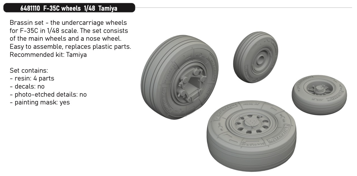 Eduard - Lockheed-Martin F-35C wheels 1/48 (for Tamiya kits) Brassin set the undercarriage wheels for F-35C in 1/48 scale. The set consists of the main wheels and a nose wheel. Easy to assemble, replaces plastic parts. Recommended kit: Tamiya