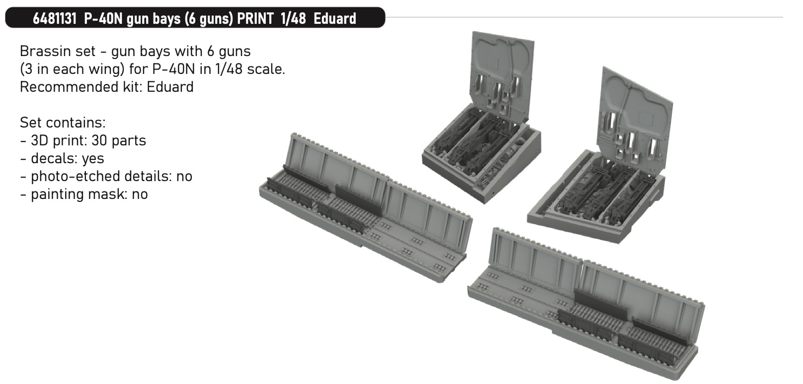 Eduard - Curtiss P-40N Warhawk gun bays (6 guns) Print 1/48 (for Eduard) Brassin set gun bays with 6 guns(3 in each wing) for P-40N in 1/48 scale. Recommended kit: Eduard Set contains:- 3D print: 30 parts- decals: yes- photo-etched details: no painting mask: no