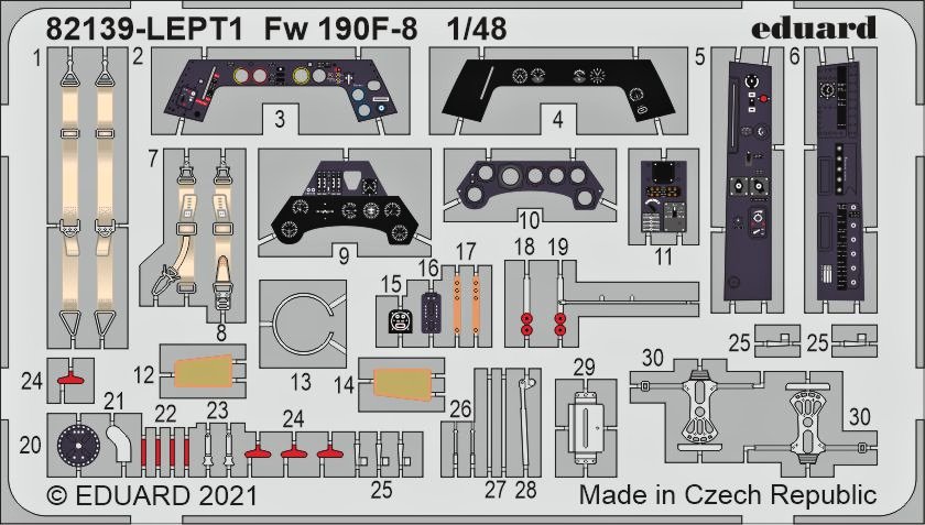 kit of WWII German fighter-bomber version of the Fw 190F-8 in 1/48 scale. plastic parts: Eduard marking options: 7 decals: Eduard Pe parts: yes, pre-painted painting mask: yes