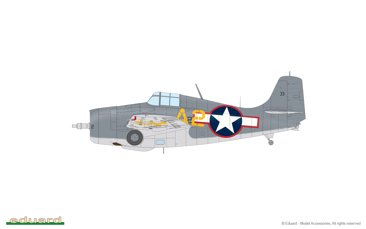 Eduard - 1/48 Grumman FM-1 Wildcat Fleet Air Arm x 2 and US Navy x 4. New tool kit! First edition. The ProfiPACK kit of US WWII aircraft carrier-based fighter FM-1 Wildcat in 1/48 scale.Kit presents FM-1 Wildcats from US Navy combat over the Pacific and the Atlantic, and also from the British FAA. Plastic parts: Eduard, marking options:6, decals: Eduard,PE parts, painting masks: yes, resin parts: no
