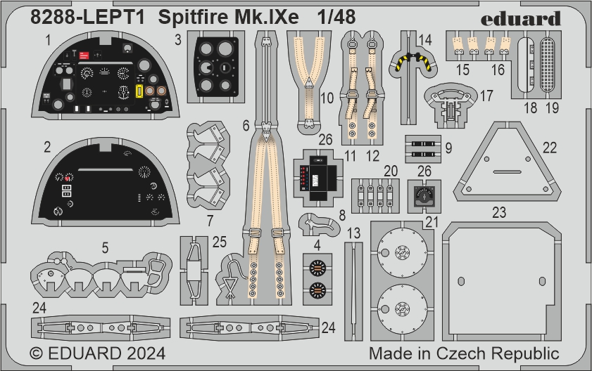 Eduard - Supermarine Spitfire Mk.IXe 1/48 The ProfiPACK edition kit of British fighter aircraft Supermarine Spitfire Mk.IXe in 1/48 scale. The kit offers to build Supermarine Spitfire Mark Nine serving in the RAF, Czechoslovak Air Foce and Israel Air Force. Plastic parts: Eduard- marking options: 6- decals:Eduard- Pe parts: yes mask: yes- resin parts: no