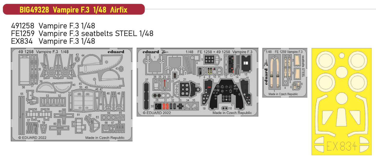 Eduard - De Havilland Vampire F.3 1/48 (for Airfix kits) (first delivered 01-06-2022) This BiG-Ed set includes all these Eduard sets.....