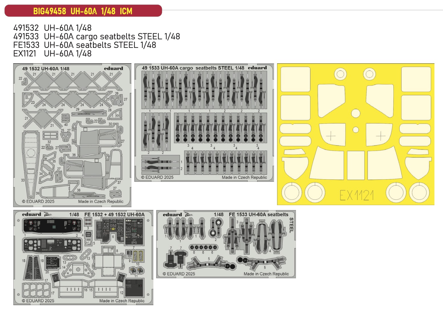 Eduard - Sikorsky UH-60A 1/48 (for Icm Ua Uk kits) This BiG-Ed set includes all these Eduard sets:ED491532 UH-60A 1/48ED491533 UH-60A cargo seatbelts Steel 1/48 EDFE1533 UH-60A seatbelts Steel 1/48 EDEX1121 UH-60A 1/48