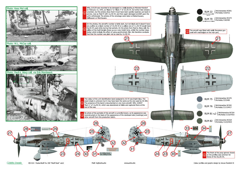 The markings for one of the very few known Fw 190 A-5s with the famous Jg 2 eagle design and a rare Fw 190 A-8 carrying the name 'Steppke', Jg 11 emblem and Jg 301 identification band, have never been reproduced in decal form before, whilst the Fw 190 D-9 with the sparcely seen bright blue band of Jg 54 was recently incorrectly identified and depicted by one of the kit manufacturers. Our instruction sheets include several photos of all depicted aircraft, some of which you may have never seen before. Illustrations were created by Janusz Swiatlon.