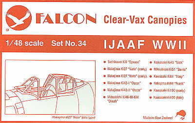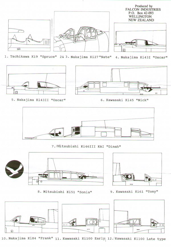 Falcon - 1/48 Imperial Japanese Army Air Force/IJAAF WWII. Tachikawa Ki-9 'Spruce' Ni Nakajima Ki-27 'Nate' early and Nakajima Ki-27 'Nate' late (for Hasegawa kits) Nakajima Ki-43-I 'Oscar' Ni Nakajima Ki-43-II 'Oscar' (for Fine Molds kits) Kawasaki Ki-45 'Nick' Ni Mitsubishi Ki-46-III-KAI 'Dinah' (for Tamiya kits) Mitsubishi Ki-51 'Sonia' Ni Kawasaki Ki-61 Hien 'Tony' (for Hasegawa kits) Nakajima Ki-84 Hayate 'Frank' (for Tamiya kits) Kawasaki Ki-100 early (for Hasegawa kits) Kawasaki Ki-100 late (for Hasegawa kits)