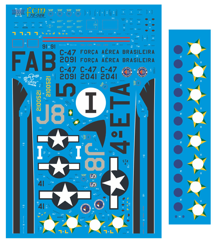 FCM - 1/72 Douglas C-47A Dakota Skytrain (3) Usaac 2100521 J8/I 92 TCS/439 Tcg D-Day stripes Upottery, Devon 1944, Brazilian Air Force 2091 4 Eta Caraja 1972, 2041 5 Eta Pegaso 1972,