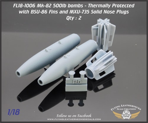 Flying Leathernecks - 1/18 MK-82 500lb bomb with BSU-86 fin, MXU-735 Nose Plug Tp 2 bombs 3D-printed For use with the Hobby Boss 1/18 AV-8B for Hobby Boss