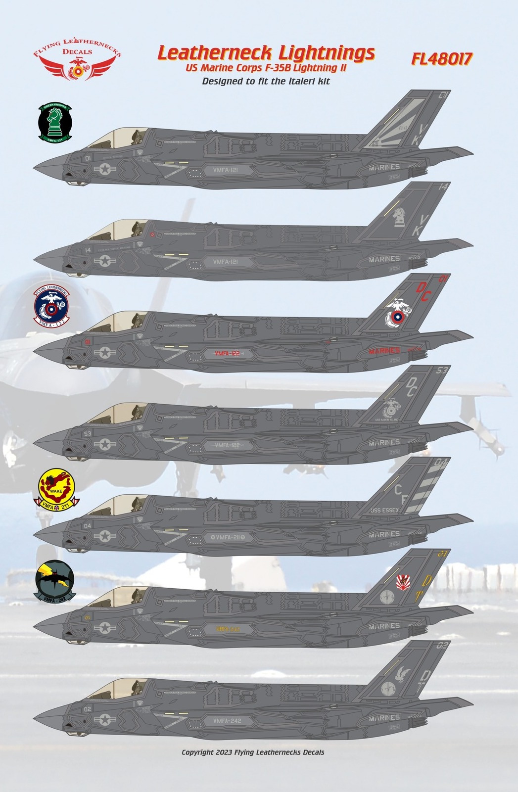 Flying Leathernecks - 1/48 Lockheed-Martin F-35B/C Leatherneck Lightnings The first of several new sheets covering the F-35B/F-35C in Marine Corps service, including two of the first Bravos to see combat with VMFA-211 in support of Operation Inherent Resolve.
